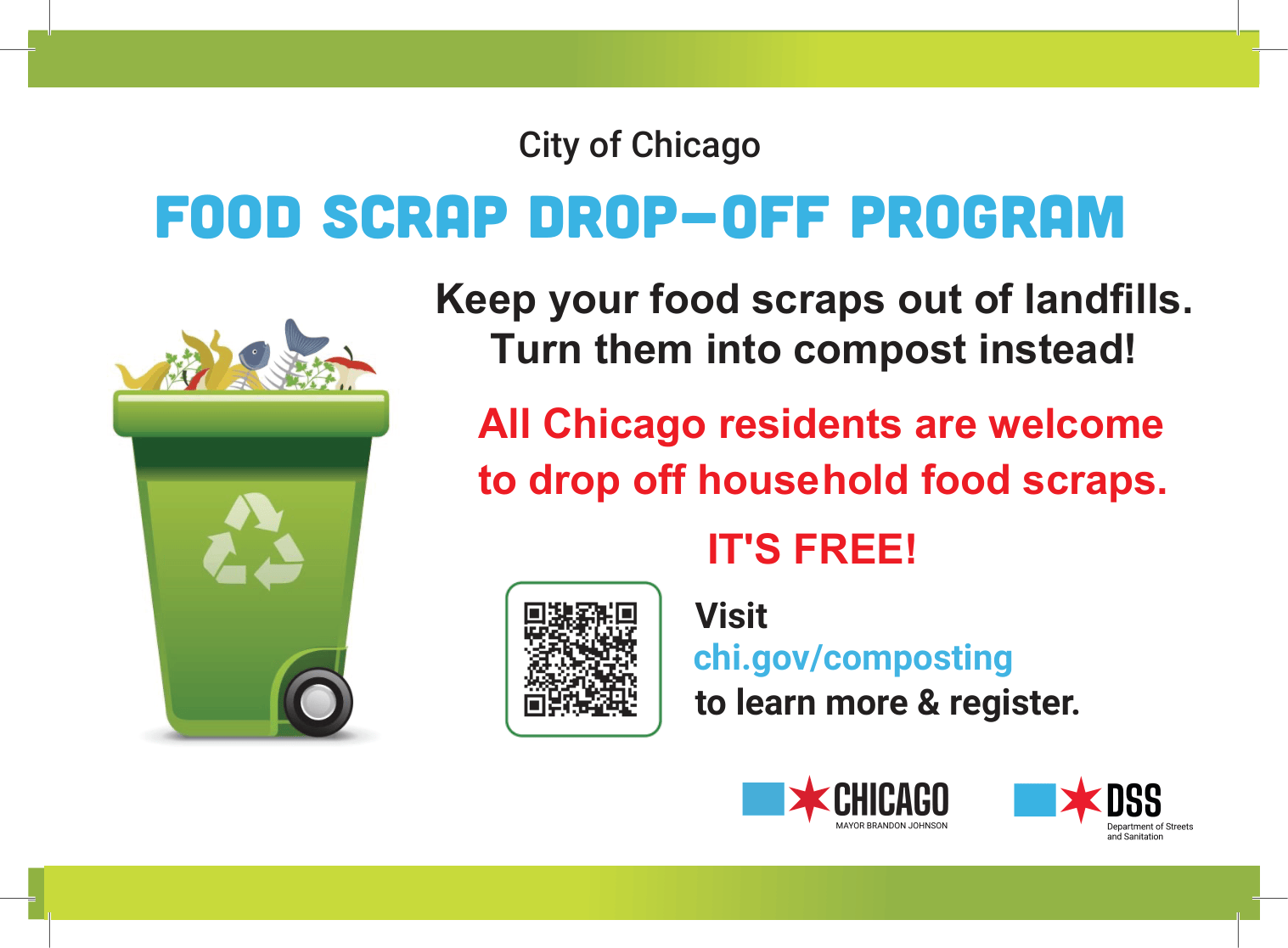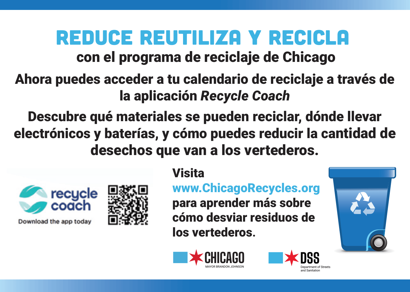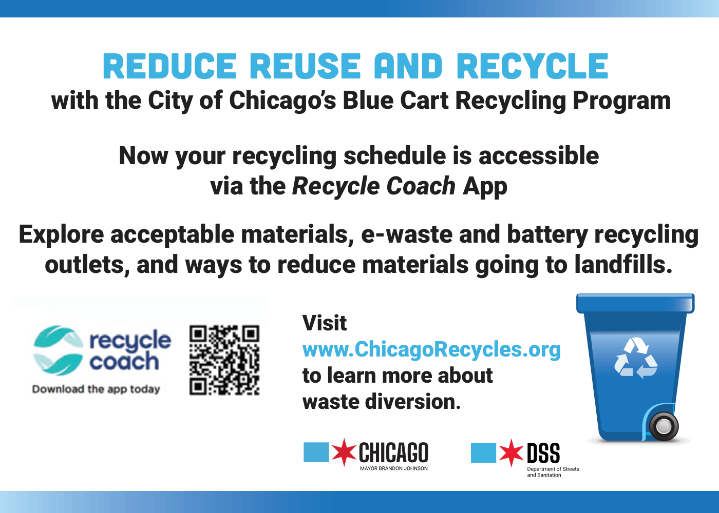 Please visit chicagorecycles.org and enter your addess to receive customized garbage and recycling information, including: